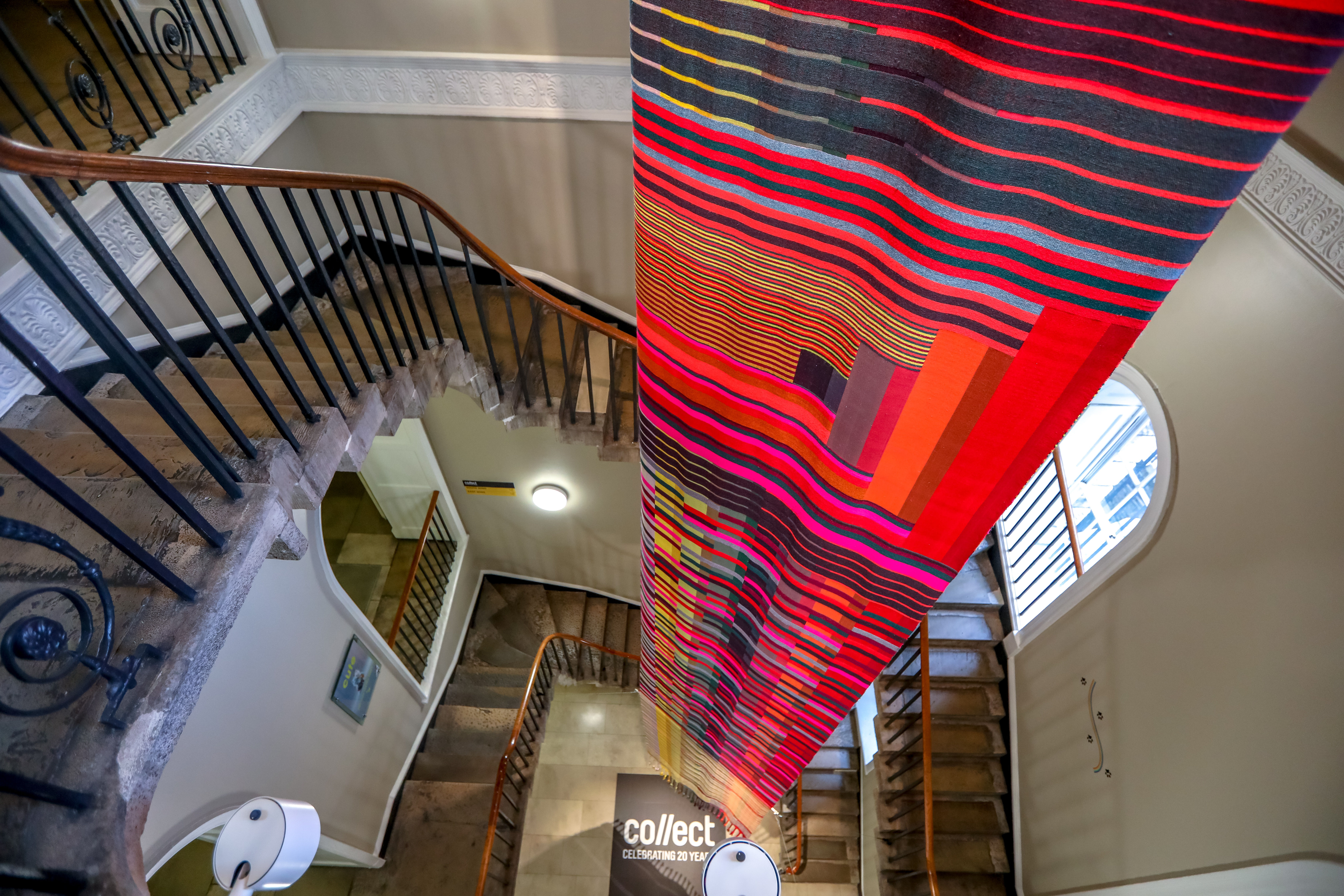 A special Collect highlight is the result of a collaboration of composer Helen Caddick and textile artist Margo Selby: the site-specific installation titled Moon Landing. The 16 m long weaving is situated within the Stamp Stairwell at Somerset House and is perceived as an element which connects several floor levels. The view onto the textile work changes with every step on the staircase, the front and the back are visible, to look down from above is as insightful as looking towards the top from downstairs. The changing light conditions depending on weather and daytime are offering a playful accessibility to colours and texture.