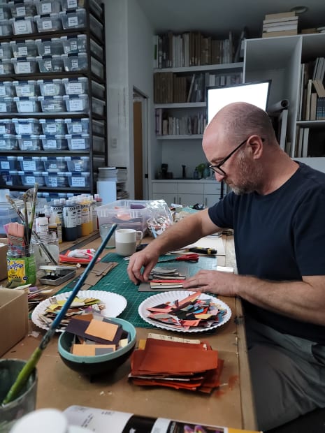 'I have been fabricating collage for over twenty-five years. I realized this because my first encounter with collage was seeing the famous Kurt Schwitters retrospective at The Centre Pompidou in Paris in 1994. I came home from that show and made my first collage using found paper and I haven’t stopped since! In these times of social upheaval and anxiety, collage remains ever more vital and life-affirming as an act of creative energy and reimagining.'